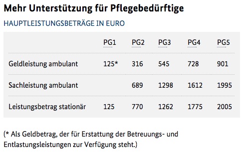 Mit der Reform geht auch eine neuerliche Anhebung des Pfelgeversicherungs-Beitrages einher. Der Jahresanfang 2015 brachte bereits eine Erhöhung von 2,05 auf jetzt 2,35 Prozent mit sich, 2017 wird der Beitrag um weitere 0,2 Prozentpunkte steigen. Im Gegenzug profitieren mehr Menschen von Hilfsleistungen. So werden in Pflegestufe 1 Menschen eingestuft, die noch keinen erheblichen Unterstützungsbedarf haben. Mit der Pflegereform können sie erstmals Leistungen der Pflegeversicherung in Anspruch nehmen, etwa eine Pflegeberatung, den Einbau einer altersgerechten Dusche oder Betreuungsleistungen. Auch soll in der vollstationären Pflege die Höhe des Eigenanteils, der aus eigener Tasche gezahlt werden muss, zukünftig nicht mehr steigen. Laut Schätzungen der Bundesregierung werden aufgrund der Reform 500.000 Menschen erstmals Ansprüche auf Pflegeleistungen haben.